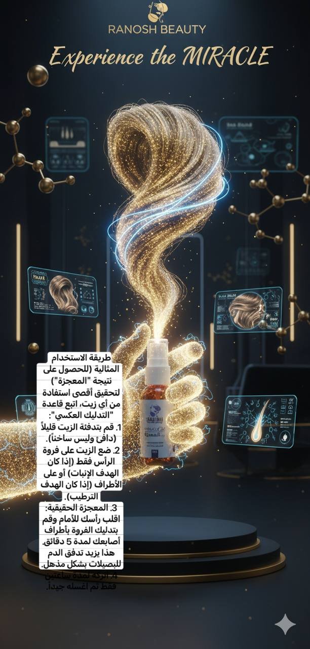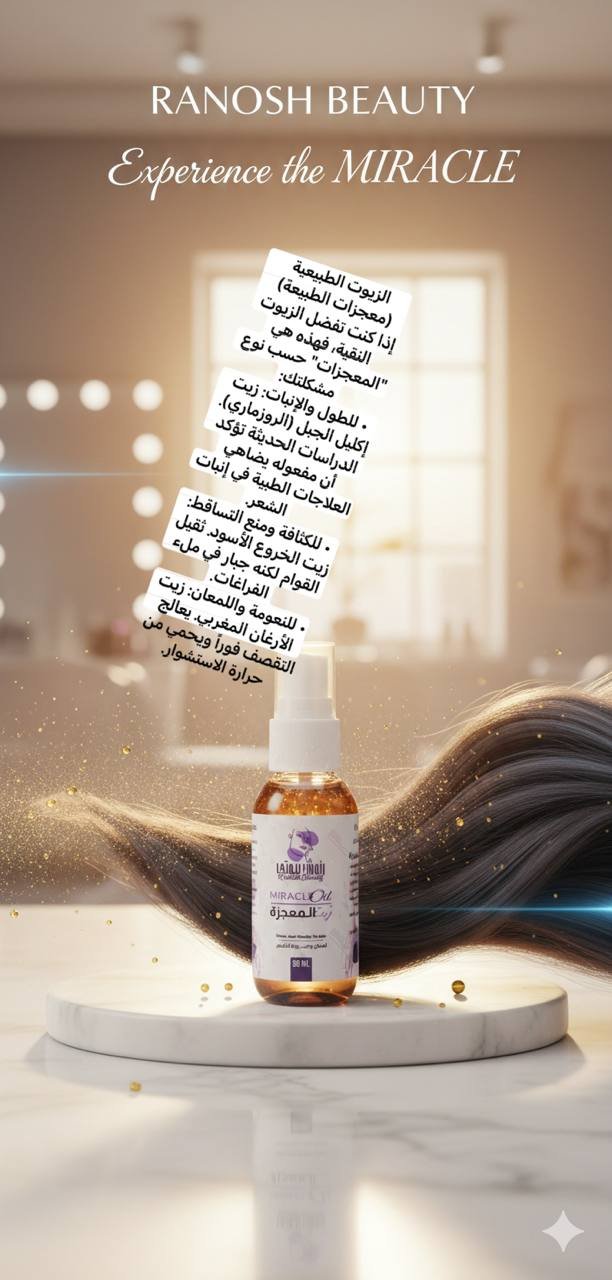 زيت المعجزة من شركة رنوش بيوتي (Ranoosh Beauty) هو منتج حقق شهرة واسعة جداً على منصات التواصل الاجتماعي (خاصة تيك توك وإنستغرام) في الآونة الأخيرة، ويُعرف بتركيبته التي تعتمد على الأعشاب والزيوت الطبيعية المركزة.